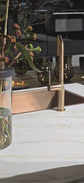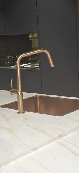 Das Quooker-System besteht aus einem kleinen Tank im Küchenschrank, der an den Kochendwasserhahn an der Arbeitsplatte angeschlossen ist. Der Tank fungiert als Thermoskanne, die an das Wasserversorgungsnetz angeschlossen ist. Die Luft in der isolierten Wand ist so dünn, dass die Wärme nicht entweichen kann.